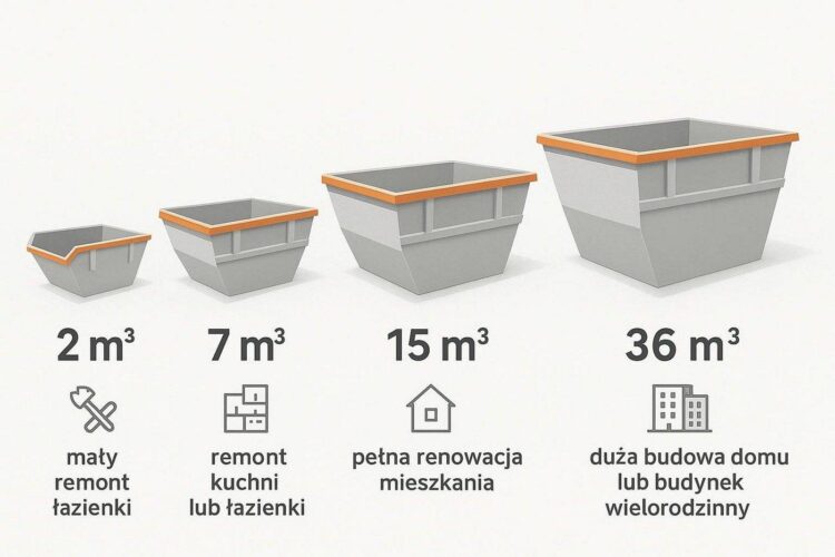 Małe sprawdzą się przy drobnych remontach, duże przy dużych inwestycjach. Zakres pojemności: od ok. 1,7 m3 do 40 m3.